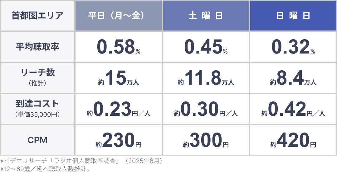 首都圏に届く放送エリアと高い聴取率を持ちながら、CM料金はローカル局設定。キー局と比べ、抑えた予算で費用対効果の高い広域訴求が可能です。