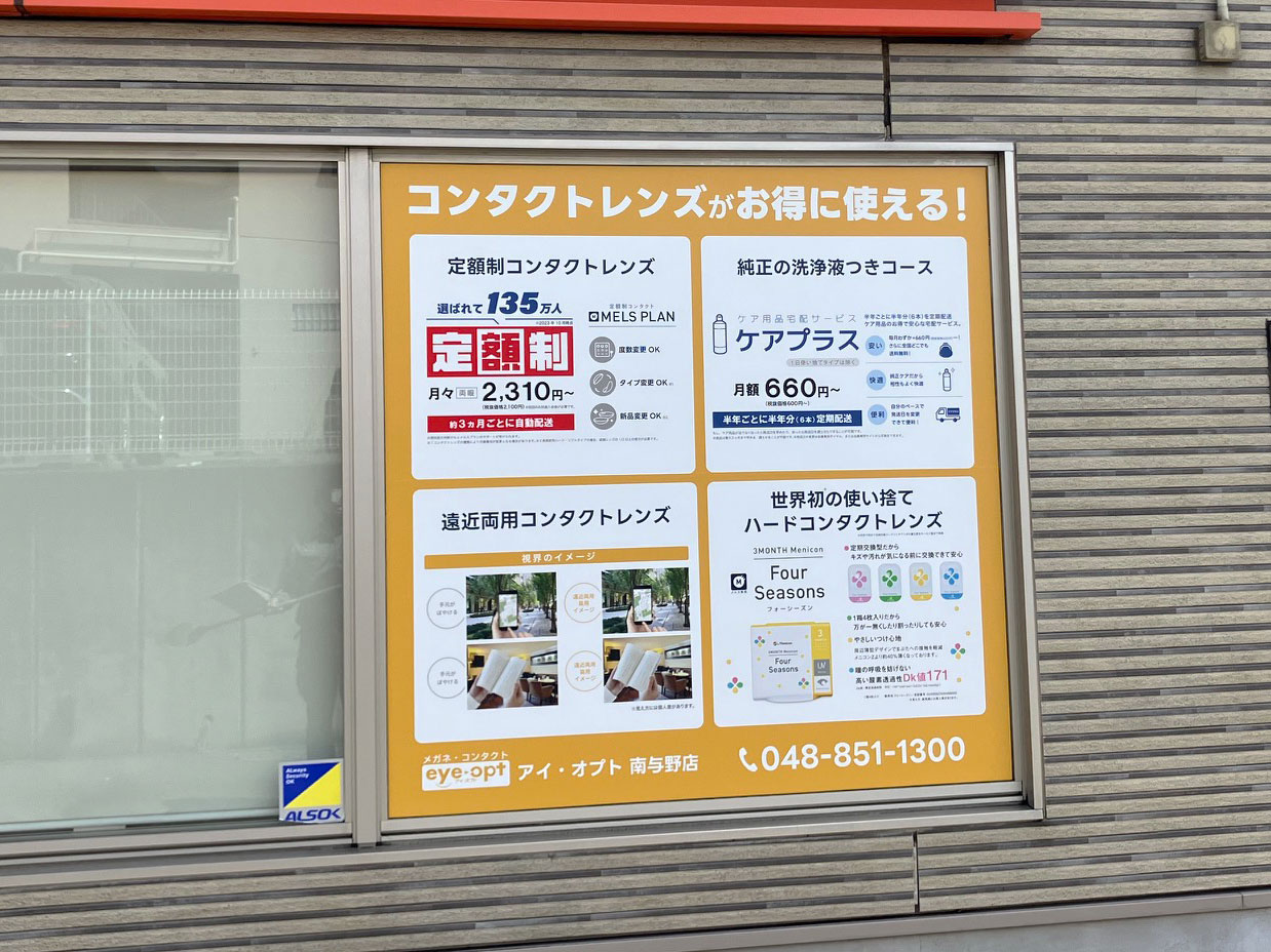コンタクトレンズの料金プランやサービス内容を、通行人にも直感的に伝わるよう整理し、視認性と訴求力を重視したデザインに仕上げています。